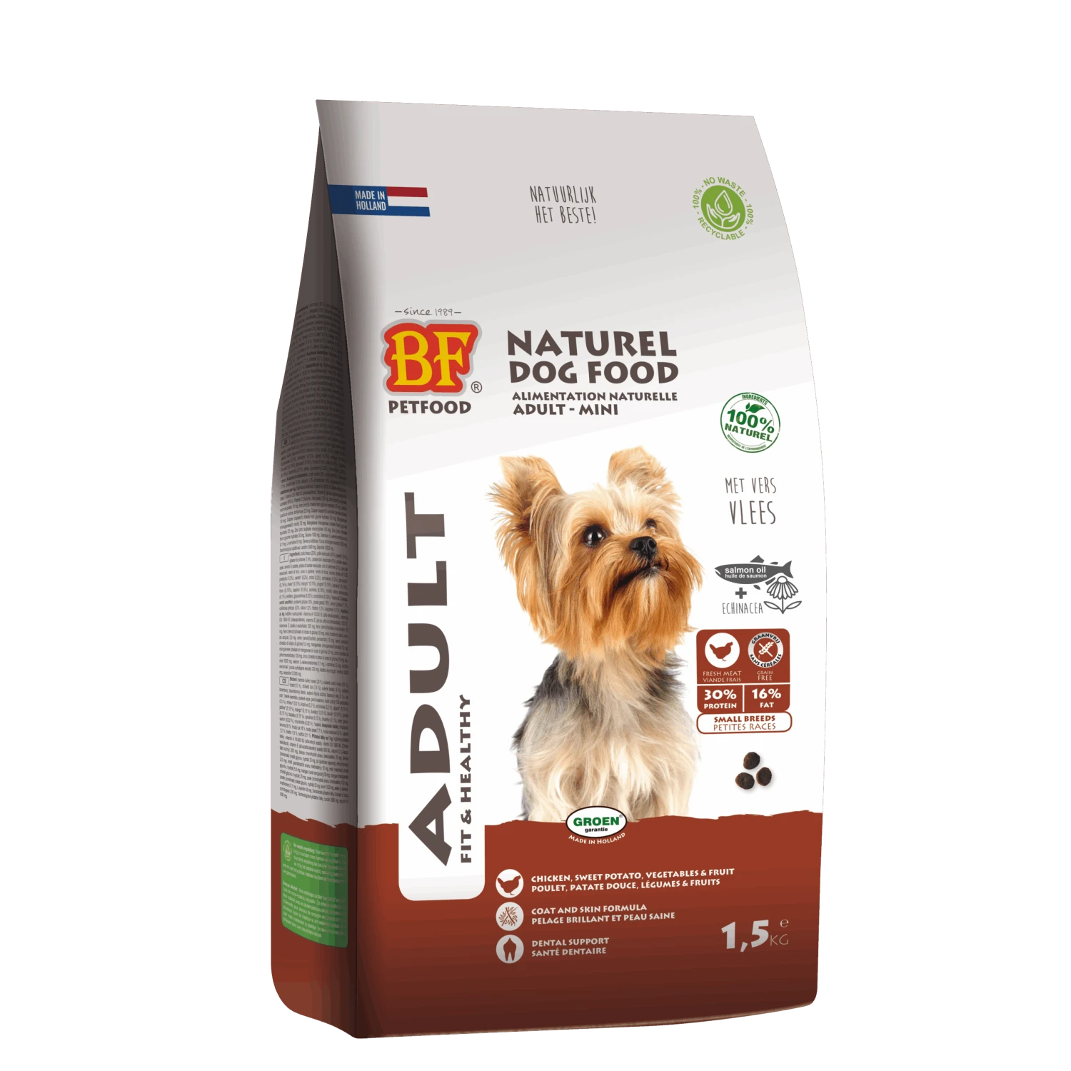 BF Petfood® adult mini is een volledige licht verteerbare, premium en zeer smaakvolle graanvrije hondenvoeding voor volwassen honden van kleine rassen. Rijk aan kip (vers en gedroogd). Met zoete aardappel. Graan- en glutenvrij. Optimale brokgrootte, -vorm en -structuur. Hoge acceptatie en verteerbaarheid. Ondersteunt huid en vacht, afweer, gewrichten en gebit. Inuline FOS (prebiotica) stimuleert de darmflora en ondersteunt hiermee de gezondheid. Gezonde voeding die zorgt voor een optimale vertering, ontlasting en een goede conditie van uw hond. Beperkt geur en volume van de ontlasting.