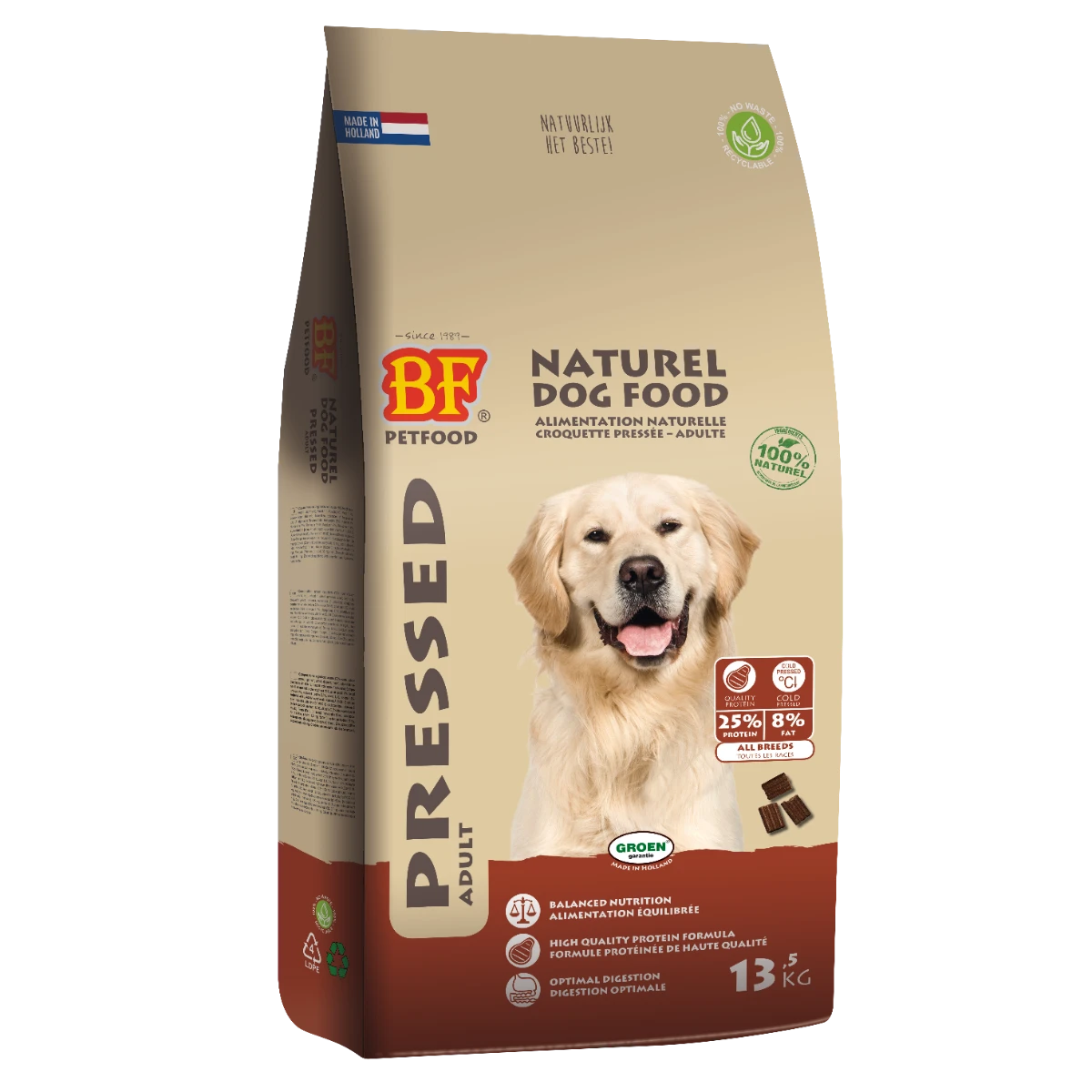 BF Petfood® geperst adult. Nederlandse topkwaliteit. Hoogwaardige premium en natuurlijke grondstoffen. Volledige geperste hondenvoeding voor volwassen honden. 30% aan rund, kip en vis. Hoge acceptatie en verteerbarheid. Lage maagbelasting en verhitting van de brok. Ideaal voor kieskeurige en moeilijke eters. Zonder chemische toevoegingen. Optimale voeding die zorgt voor een betere vertering, ontlasting en een goede conditie van je hond. Voor alle hondenrassen.