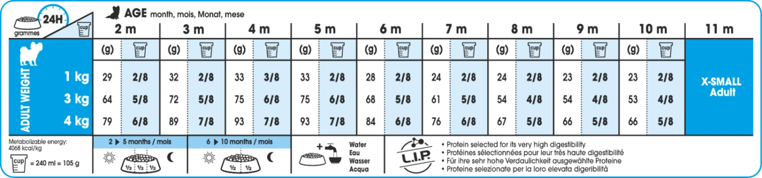 ROYAL CANIN® X-Small Puppy is geschikt voor puppy’s van extra kleine rassen tussen de 2 en 10 maanden leeftijd en een volwassen gewicht van minder dan 4 kilogram.